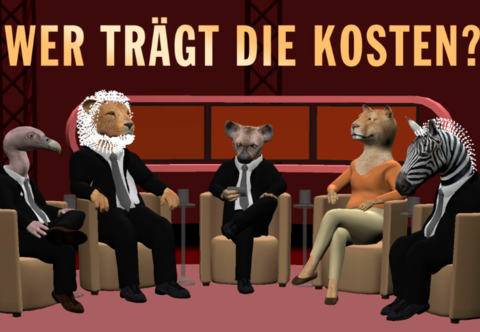 „Wer trägt die Kosten“ is the title of a four minute 3D animation film of Daniel Nocke. The story is oriented around the political talk show and deals with the subject of the unjust power distribution in the society, in which only the strong and rich defines rules. The movie was honored with the Short Tiger in 2016. The motivation of the jury is as follows: „The theme music and narrator points out to the world of political talk shows. (…) WER TRÄGT DIE KOSTEN - is a short cinematic art piece as per its content and form.